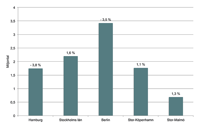 Befolkningen i båda Stockholm, Köpenhamn och Stor-Malmö ökade mer än i de två tyska städer Hamburg och Berlin. Befolkningsökningen var störst i Stockholm, som fick 1,6 procent fler invånare i 2014. I Köpenhamn ökade befolkningen 1,1 procent och 1,3 procent i Stor-Malmö.