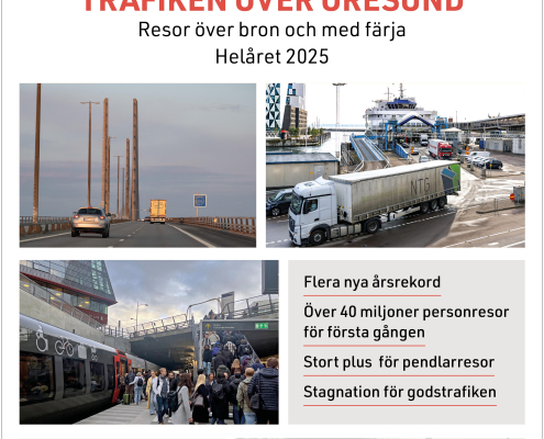 Trafiken och resandet över Öresund ökade till nya rekordnivåer under 2025. Antalet personresor med bil, tåg och färja ökade med 6,7 procent och passerade för första gången 40 miljoner. Det motsvarar 112 309 dagliga personresor. Antalet pendlarresor över sundet ökade ännu mer, med 10 procent, men under slutet av förra året dämpades utvecklingen. Godstrafiken har stagnerat.