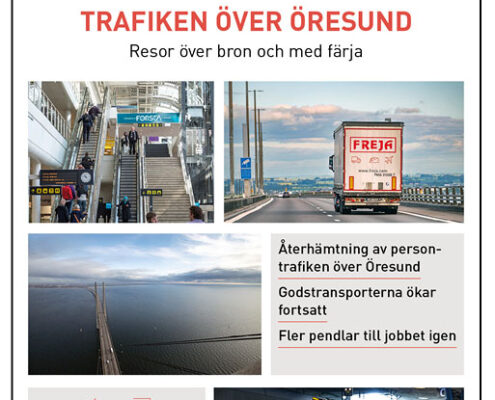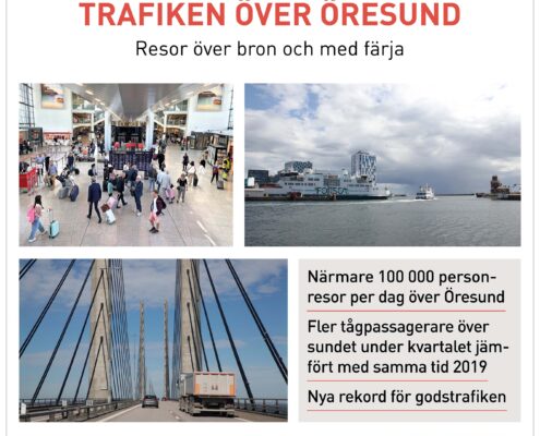 Trafiken över Öresund har kommit igång igen. Under första kvartalet 2022 gjordes i snitt drygt 61 800 personresor över sundet per dygn. Coronarestriktionerna upphävdes i februari/mars och under kvartalet ökade trafiken med 185 procent jämfört med samma kvartal 2021, som hade bottenrekord. Samtidigt låg trafiken cirka 20 procent under nivån för motsvarande kvartal 2019. Det märks en ökning för både bro-, färja- och tågtrafiken samt godstransporterna. Godstrafiken, som även ökade under 2021, har fortsatt att växa under det första kvartalet 2022.