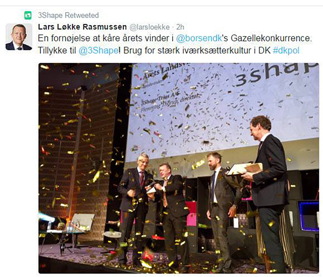 Danmarks statsminister Lars Løkke Rasmussen gratulerade 3Shape till utnämningen till 2016 års danska Gazelle. Foto: 3Shape