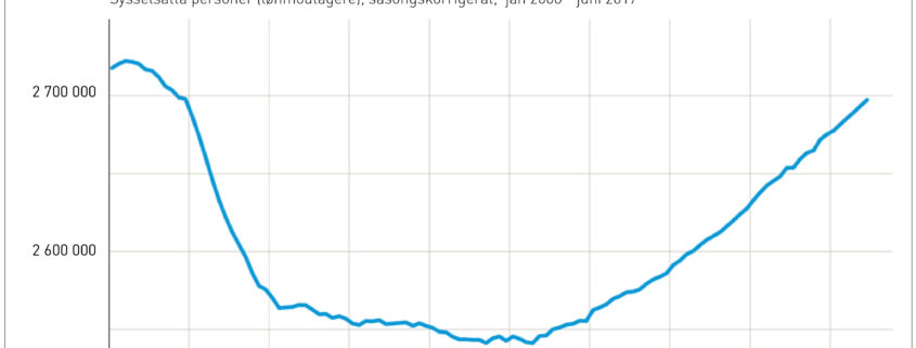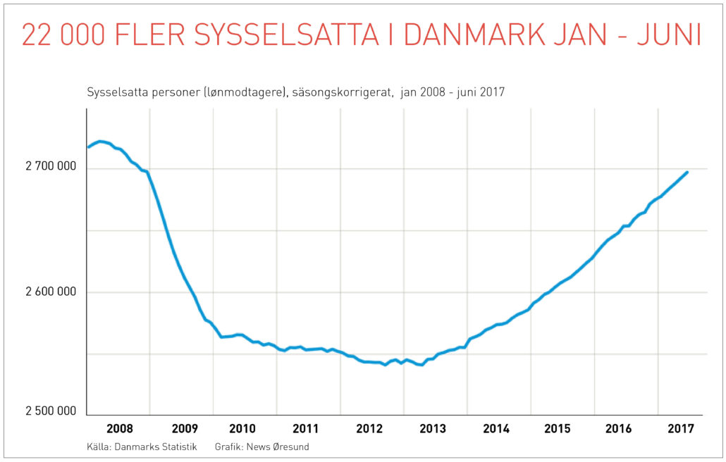 Under första halvåret 2017 steg antalet sysselsatta (beskæftigelsen) med 22.000 personer eller med 0,8 procent. Samma period 2016 ökade sysselsättningen med 26 100 personer eller med 1,0 procent.