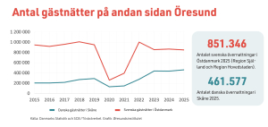 Trots denna utveckling var antalet svenska övernattningar i Danmark dubbelt så högt (851 346) som antalet danska övernattningar i Skåne (461 577) 2025.