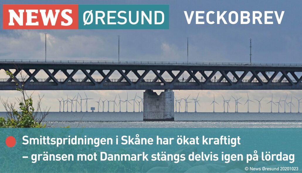 Smittspridningen i Skåne har ökat kraftigt – Danmark stänger delvis gränsen mot Skåne igen på lördag - Köpenhamns överborgmästare Frank Jensen avgår - Arbetsförmedlingen planerar neddragning på Øresunddirekt