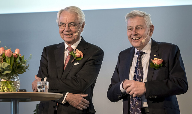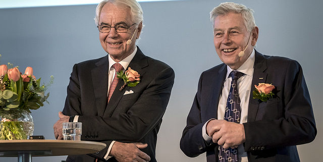Medicon Village ordförande, professor Göran Grosskop, och dess grundare, byggentreprenören Mats Paulsson presenterar den nya insamlingsstiftelsen Forget i samband med Medicon Village femårsjubileum. Foto: News Øresund.