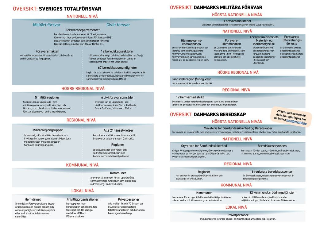 Både Danmark och Sverige utökar sin militära kapacitet och sitt civila försvar som en följd av den ökande oron i Europa, men gör det på olika sätt. Medan Sverige har ett tydligt organiserat totalförsvar, har Danmark en försvarsmodell som involverar både militära och civila aktörer, men utan samma tydliga koppling. Men den 20 februari i år beslutade regeringen att lansera totalberedskap även i Danmark.