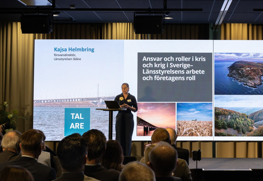 Med 320 samhällsbyggare framför sig talade Skånes försvarsdirektör Kajsa Helmbring vid Øresundsinstituttets konferens Real Estate Øresund om Sveriges nya totalförsvar där det planeras för att under minst tre månader kunna möta och hantera ett krig.